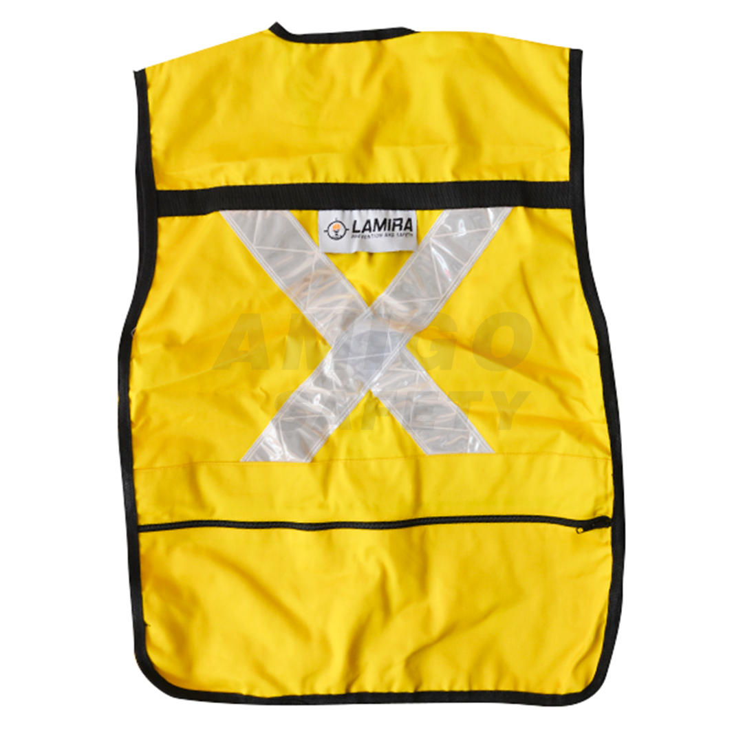 Chaleco rescatista amarillo LAMIRA®, modelo LS-4415, fabricado en gabardina abierta de alta resistencia al rasgado. Incorpora tres hebillas de ajuste en cada costado para un ajuste seguro. Cuenta con seis bolsillos funcionales, cinco frontales, y mica porta gafete al frente, ideal para trabajos de rescate y seguridad.