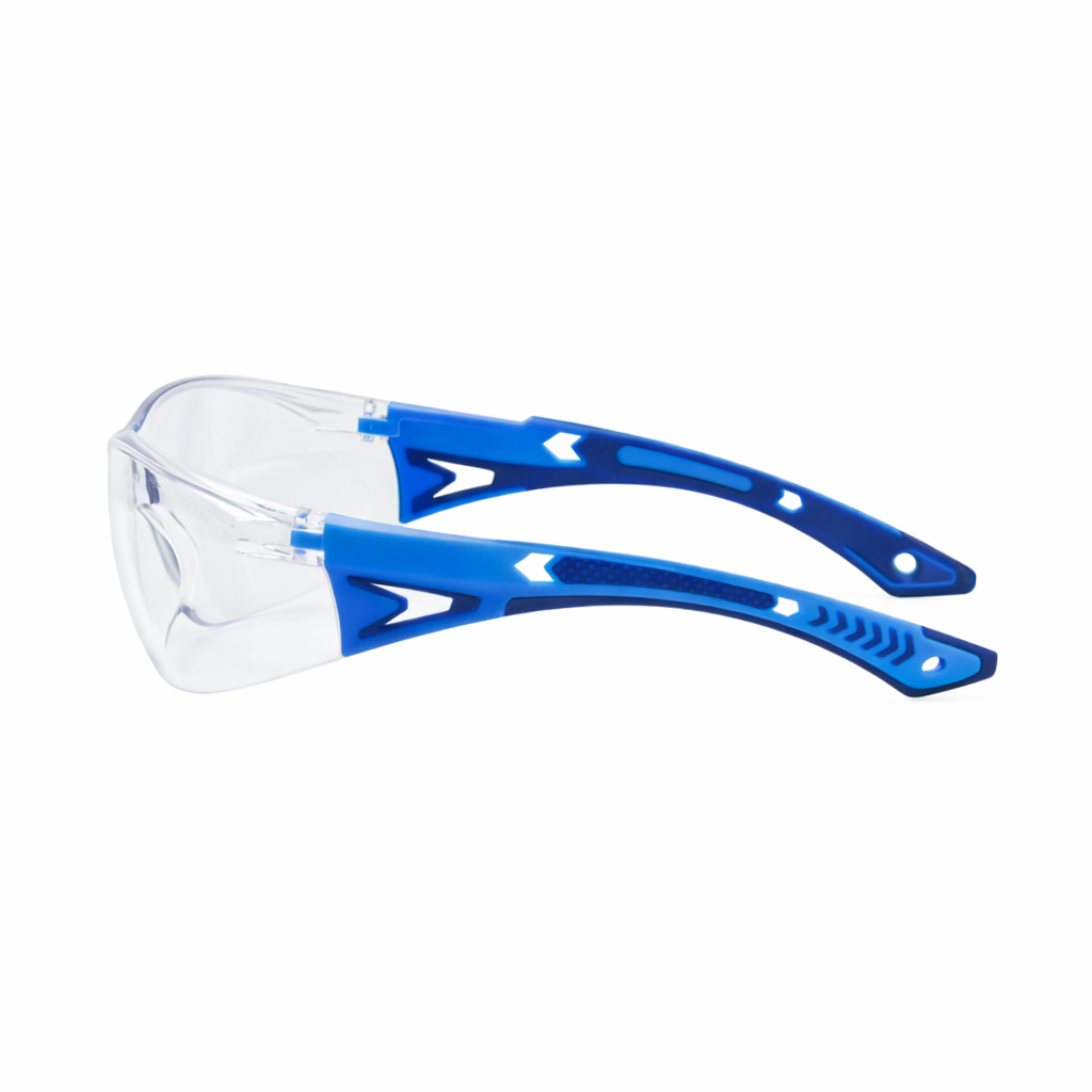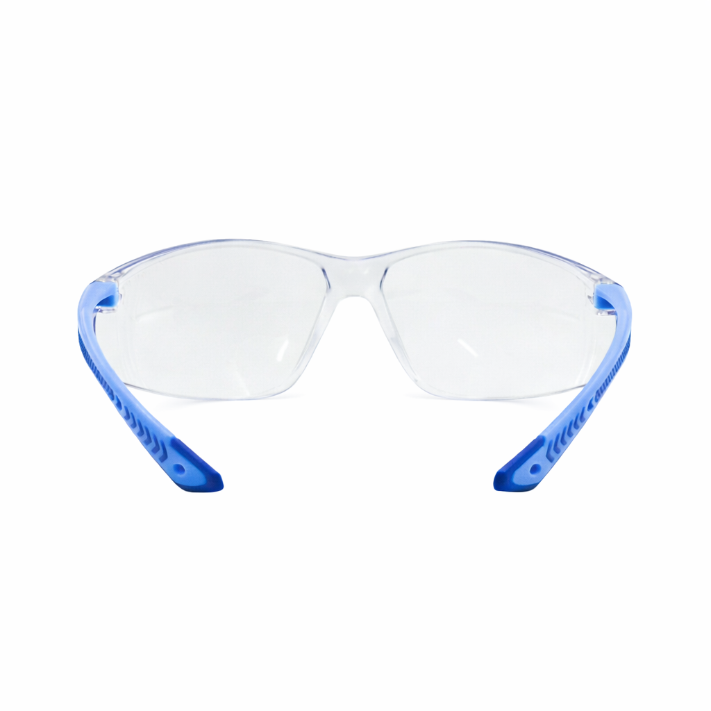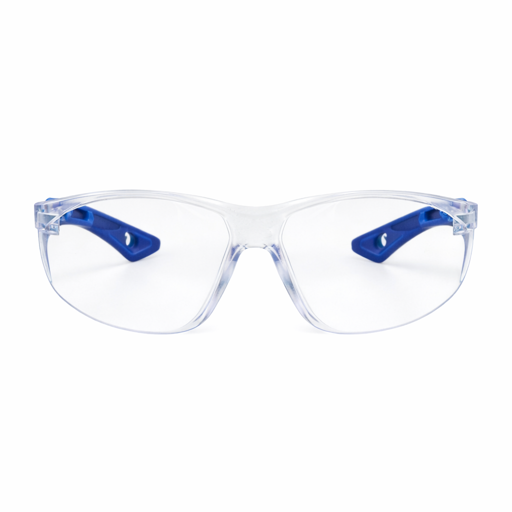 Lente de seguridad fabricado en policarbonato transparente con recubrimiento antiempañante, marca LAMIRA, modelo AS-4475AF, diseñado para brindar máxima claridad visual y confort. Incorpora patillas azules extraíbles que permiten una adaptación versátil según las necesidades del usuario, así como un puente nasal suave y desmontable que mejora la ergonomía durante su uso prolongado. Su innovador sistema sin tornillos en bisagras ni puente nasal reduce el mantenimiento y aumenta la durabilidad del producto. Ofrece una eficaz protección ocular al absorber hasta el 99.9 % de los rayos UVA y UVB. Su diseño ultraligero, con un peso aproximado de 24 gramos, garantiza comodidad, estabilidad y seguridad en actividades industriales y de riesgo.