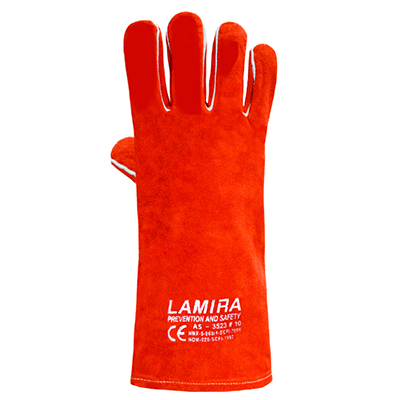 Guante para soldador color rojo, marca Lamira, modelo AS-3523, diseñado para aplicaciones industriales que demandan alta resistencia térmica y mecánica. Está fabricado con materiales de gran durabilidad, ofreciendo un equilibrio óptimo entre protección y comodidad. Incorpora forro interior que mejora el confort y reduce la fatiga durante jornadas prolongadas. Sus costuras ribeteadas proporcionan un ajuste más cómodo y seguro, evitando roces en la piel. Las uniones están cosidas con hilo de Kevlar, lo que incrementa significativamente la vida útil del guante y su resistencia al calor y al desgaste. Además, cuenta con un tratamiento especial que aporta mayor flexibilidad y prolonga su desempeño. Es ideal para trabajos de soldadura, herrería, metalmecánica y procesos industriales donde se requiere protección confiable y rendimiento constante.